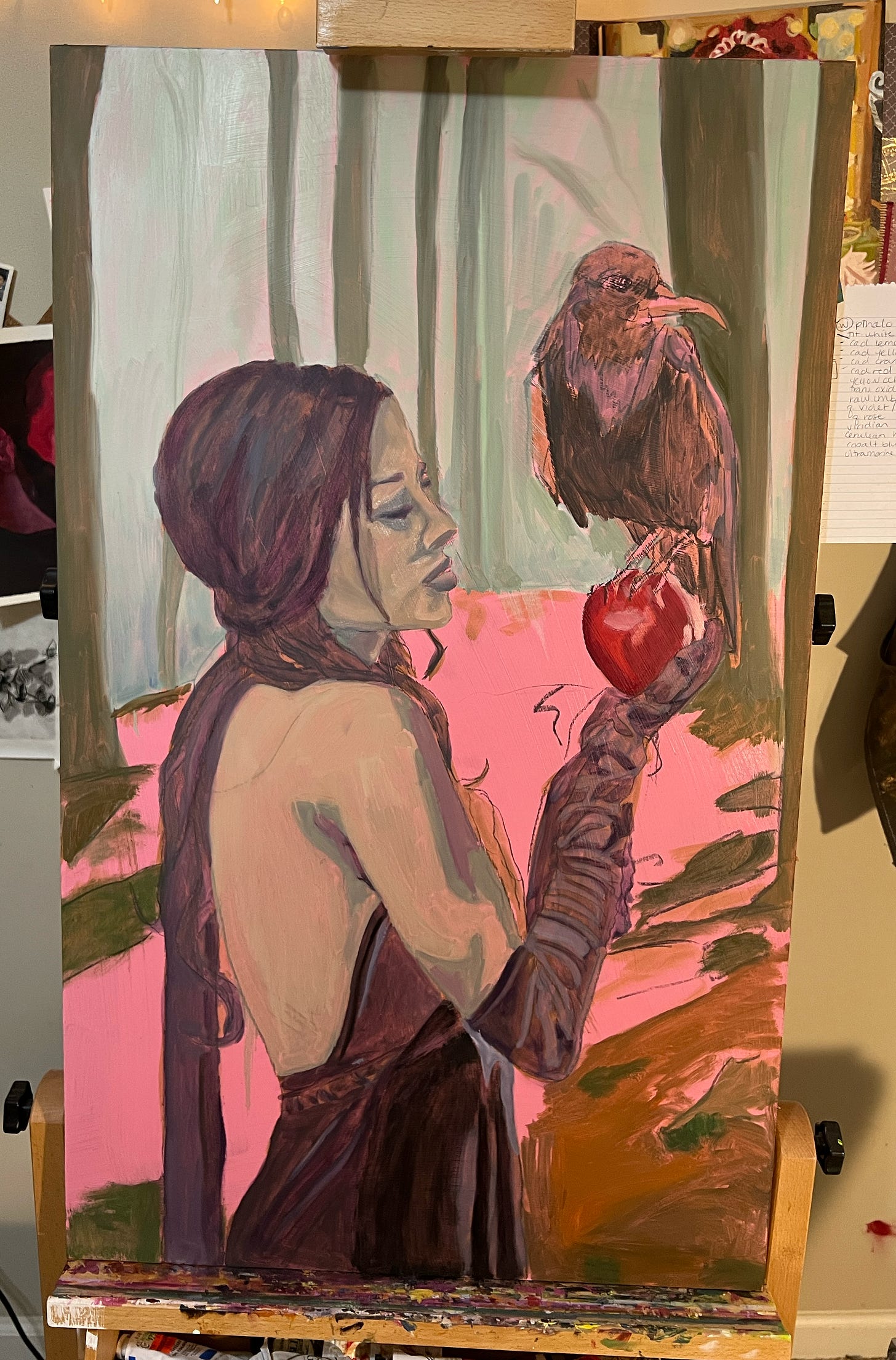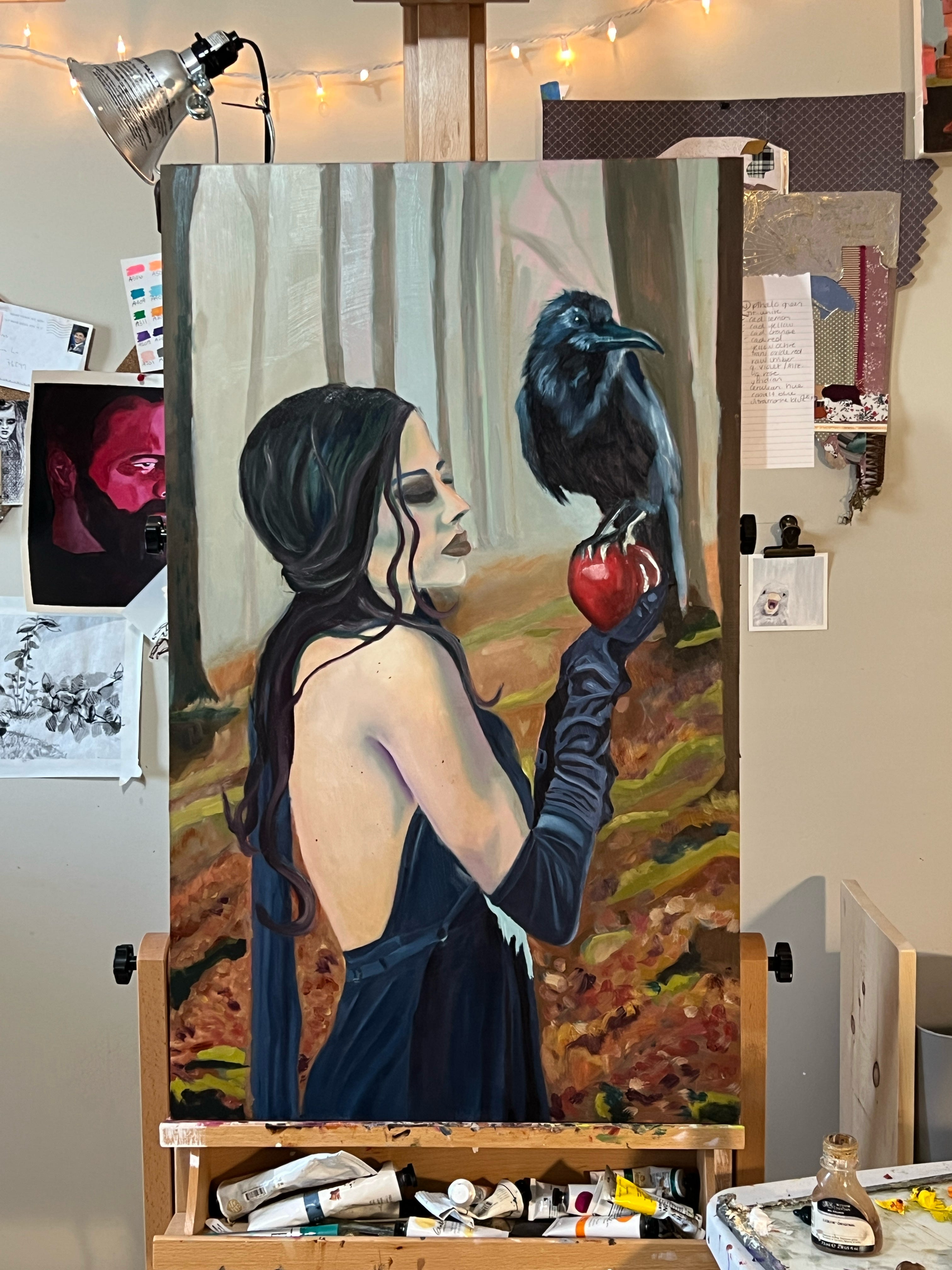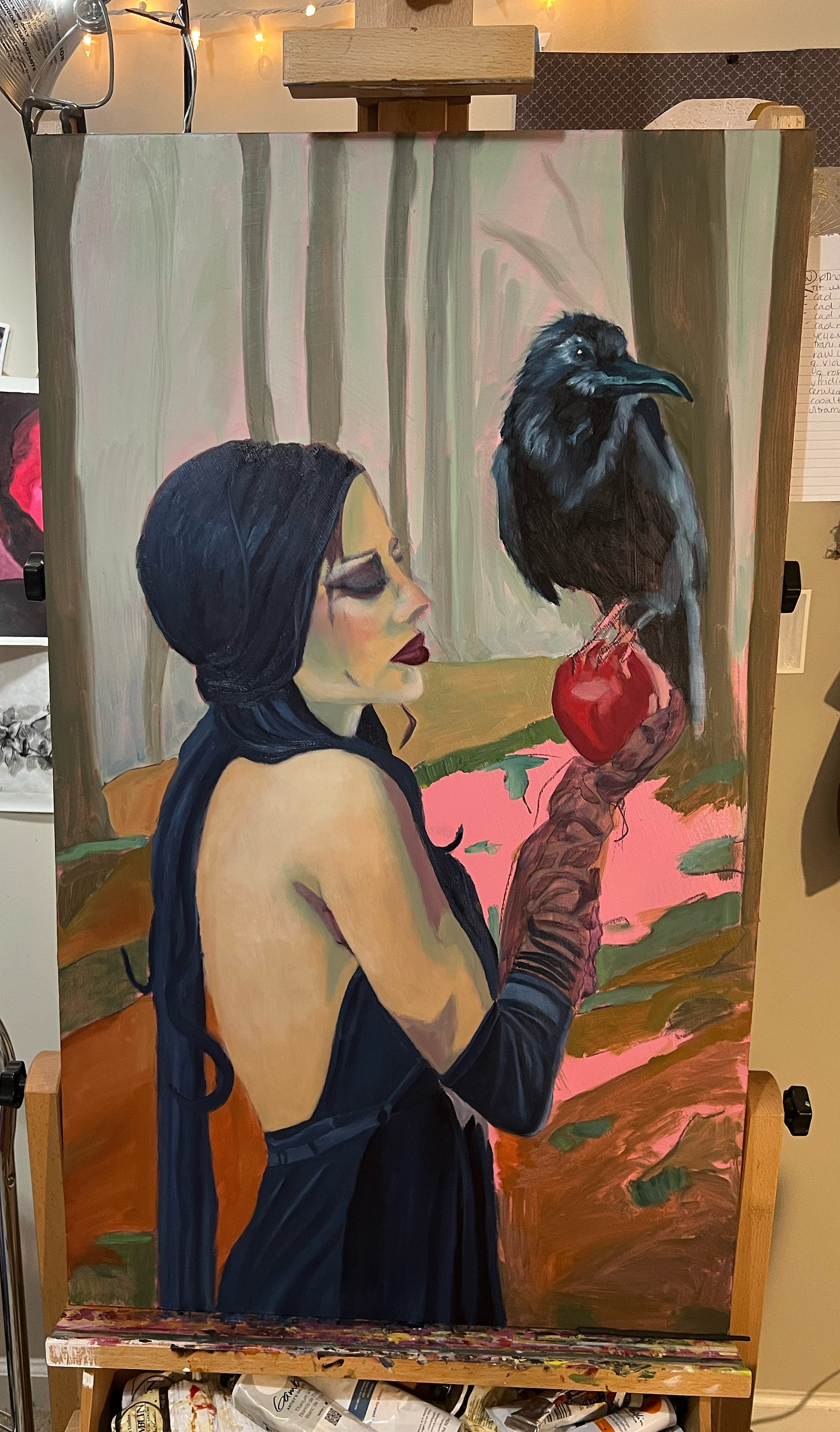 I try not to get hyper-focused on one area or part of the painting and build it up evenly over time, but I also am terrible at that and so I definitely got focused on some areas first, like the raven and Morgana’s dress. Sometimes a painting can be intimidating to work on, so I focus on what I can do in the moment and try to forget about the other parts. This sounds good in theory, but then at the end I’m left with only the scary parts to work on and I procrastinate. It’s definitely something I’m working on!
