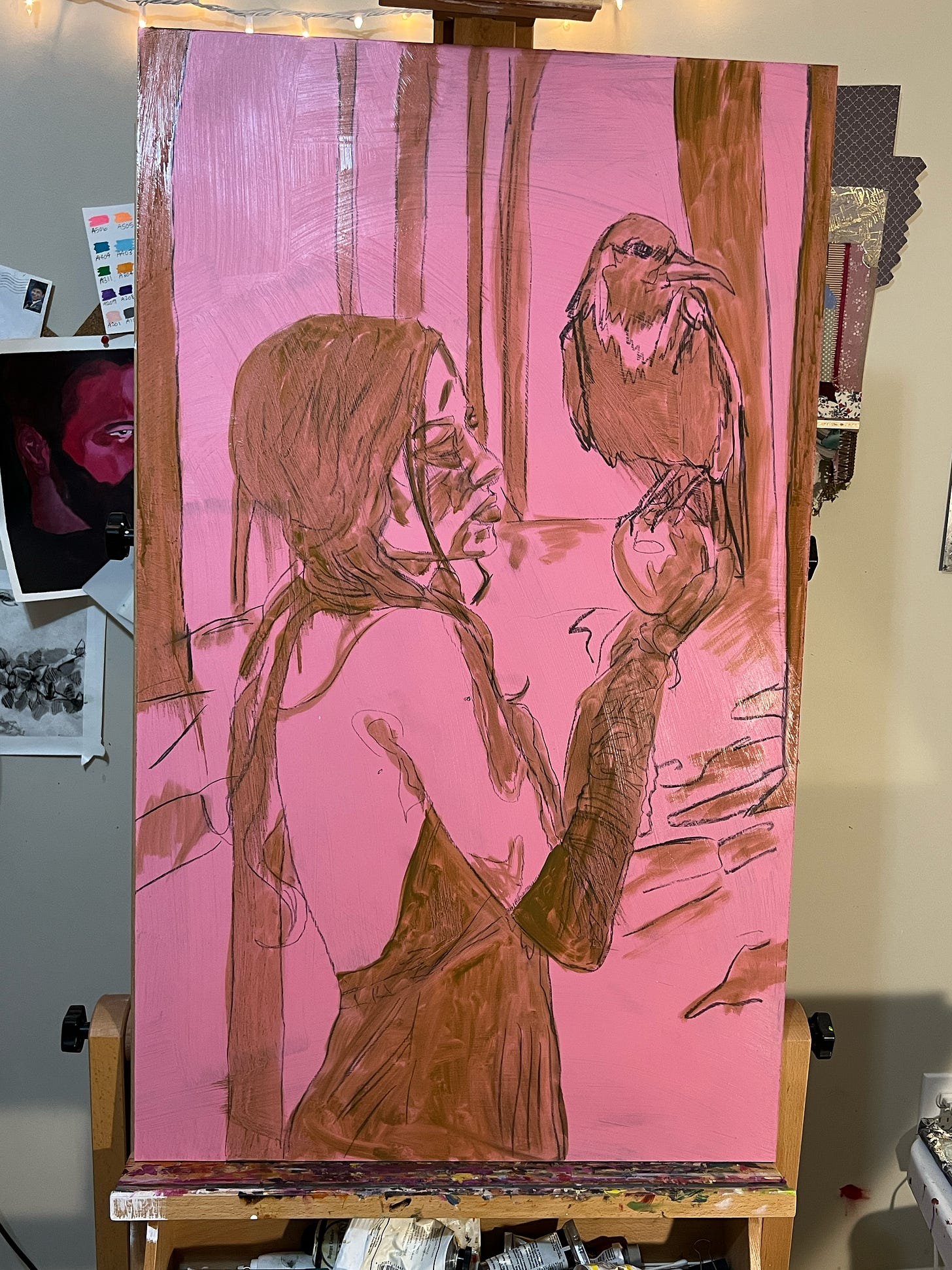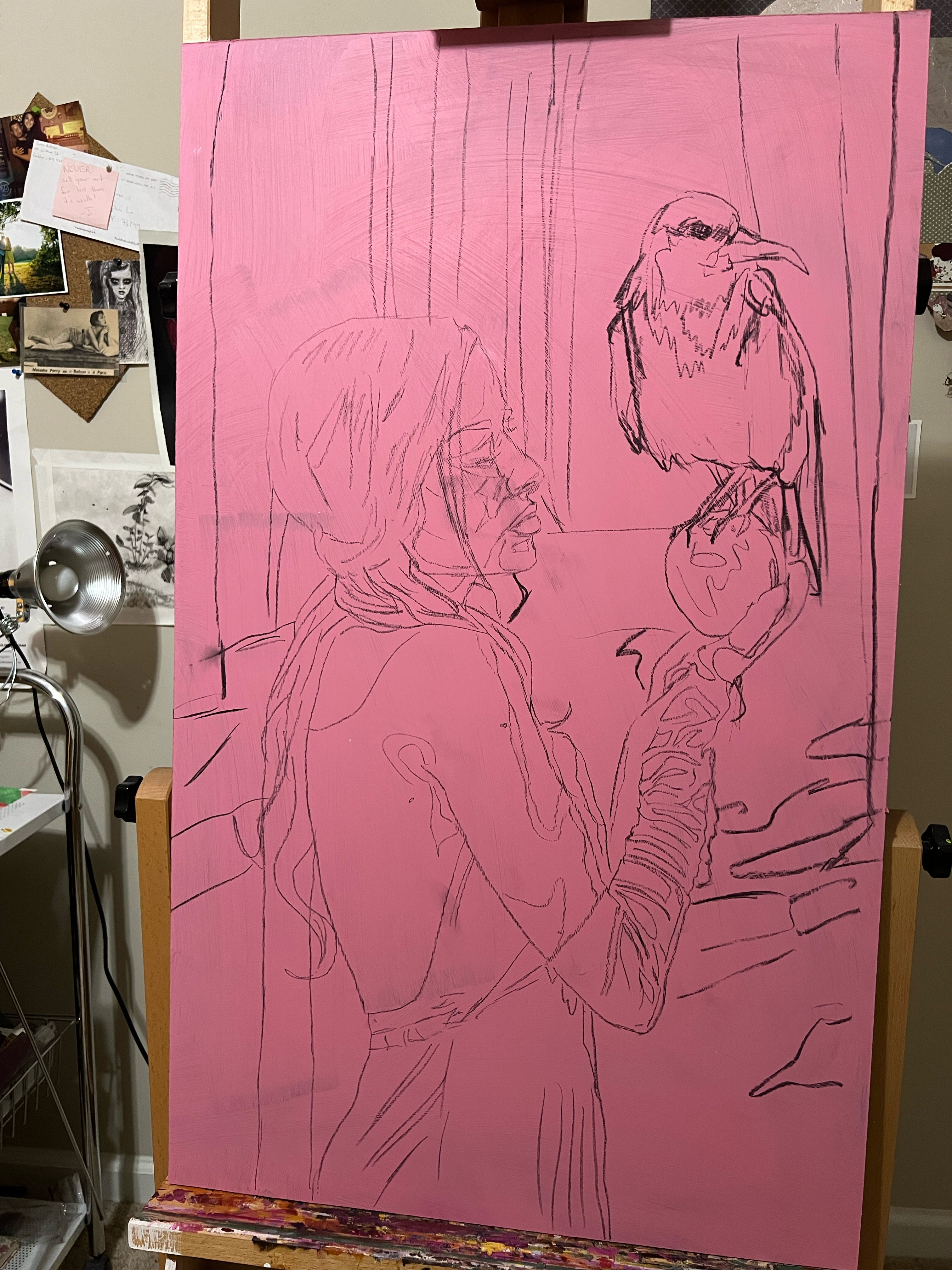 I initially sketched my composition onto the panel in charcoal and sprayed over it with a fixative spray to keep my drawing in place without it smudging everywhere.
